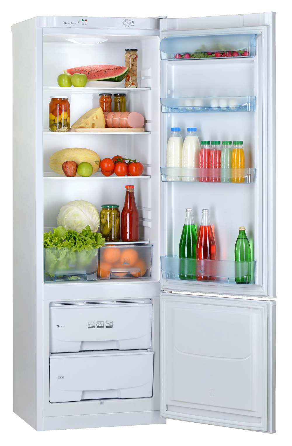 Двухкамерный холодильник с нижним расположением морозильной камеры Полочки из ударопрочного стекла выдерживают нагрузку до 40 кг. Их легко можно перемещать по высоте, что дает возможность разместить продукты в холодильной камере, максимально используя ее объем. Оригинальная полка-трансформер создает дополнительное место для хранения высоких бутылок и банок. Защита от переливания жидкости. Стеклянная полочка оснащена рамкой, которая позволяет предотвратить возможное переливание жидкости вниз. Если вы случайно разольете жидкость, она не протечет на нижнюю полку. Вместительные прозрачные сосуды для овощей и фруктов поддерживают необходимый для длительного хранения продуктов уровень влажности, сохраняют их вкусовые и питательные свойства, позволяют легко увидеть содержимое.